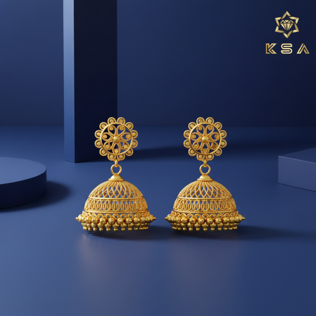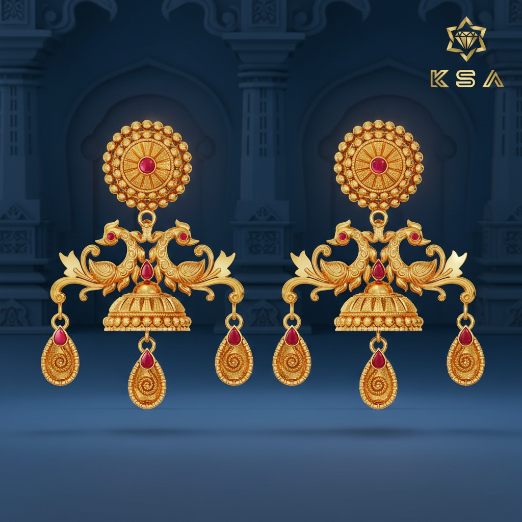 Heritage Floral Temple Gold Earrings with Teardrop Ruby | 024